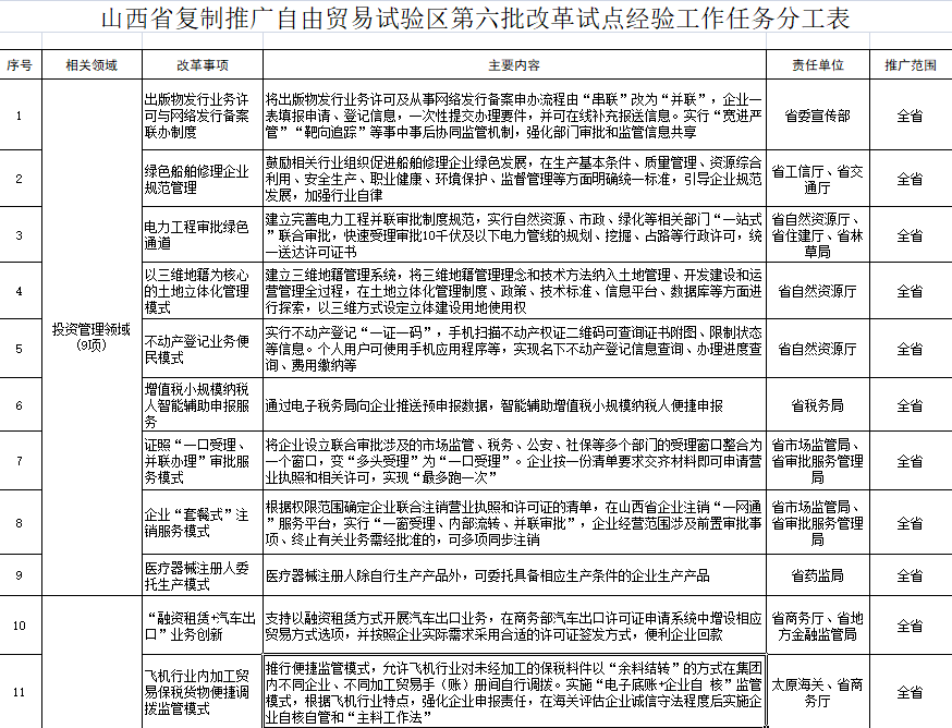 山西省人民政府辦公廳近日下發通知,要求做好復制推廣自由貿易試驗區第六批改革試點經驗工作。國務院安排部署的第六批復制推廣事項共37項,結合實施范圍要求和具體條件,山西省復制推廣31項。