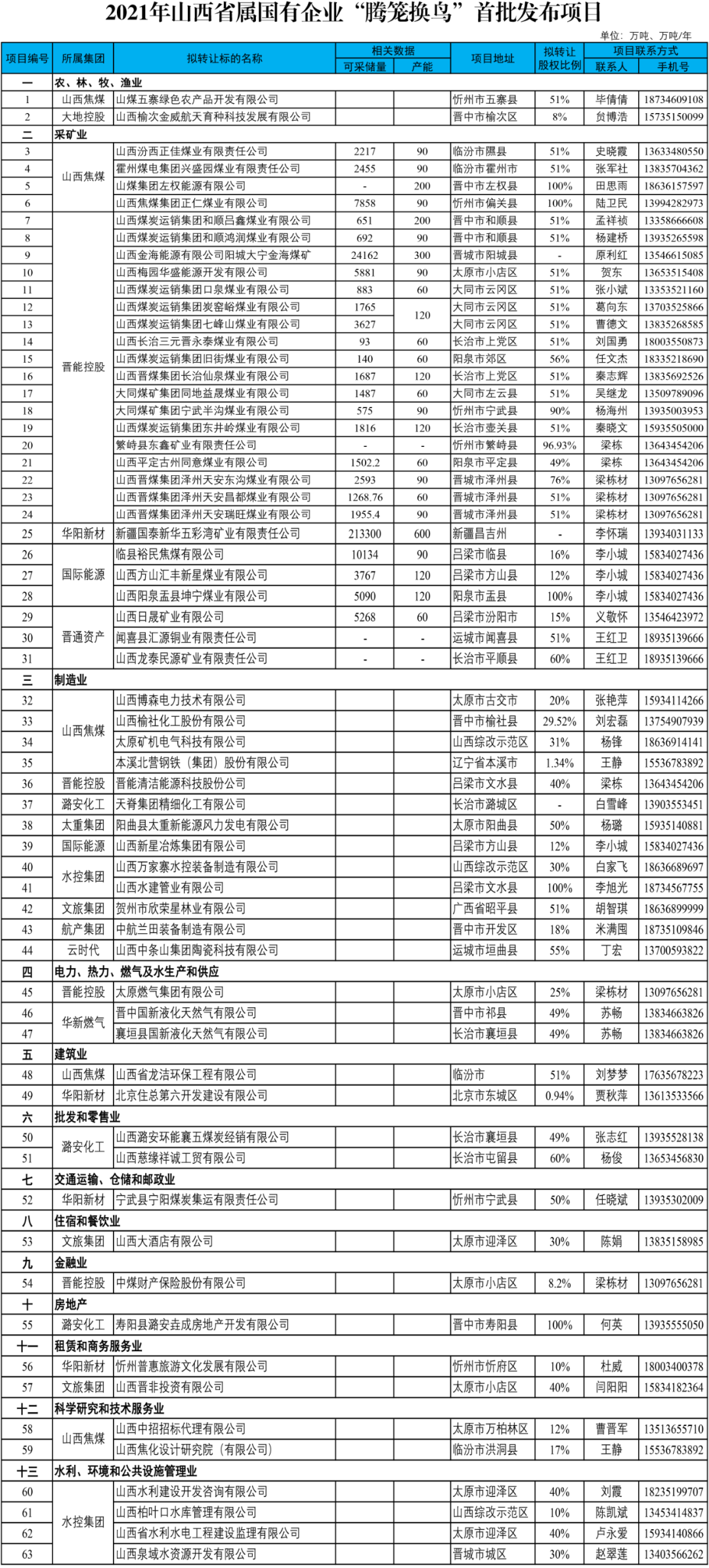 3月26日,山西省國資運營公司發布《2021年山西省屬國有企業“騰籠換鳥”首批發布項目》,包括采礦業、制造業、建筑業等13大類63個項目。采礦業中,晉能控股就一攬子拋出了18個“騰籠換鳥”項目,山西焦煤也有4個項目,有的擬轉讓股權比例達100%。