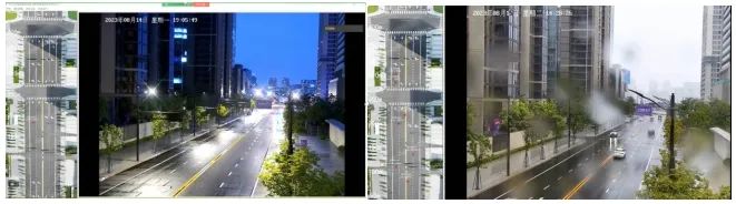 黑夜天和雨霧天車輛內可獲取超視距感知畫面(右側為攝像頭視距內畫面,左側為通感基站對道路全景的感知孿生)