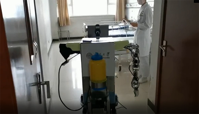測試中看到,這臺擁有一個液晶屏“腦袋”、兩個機械“手臂”的機器人“小安”可以通過手機操控在室內進行靈活穿梭,實現紅外線體溫檢測、導診分診、消毒劑噴灑、檢測樣本轉運、垃圾清運等功能,并可利用身上配備的攝像頭進行實時觀察,協助開展“遠程會診”。