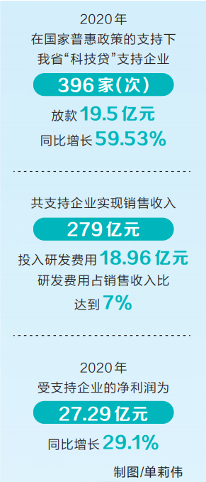 這一針對科技型中小企業“輕資產”特點量身打造的金融服務產品,一經推出就迅速發揮實效。2020年,在國家普惠政策的支持下,我省“科技貸”支持企業396家(次),放款19.5億元,同比增長59.53%;共支持企業實現銷售收入279億元,投入研發費用18.96億元,研發費用占銷售收入比達到7%;2020年受支持企業的凈利潤為27.29億元,同比增長29.1%。