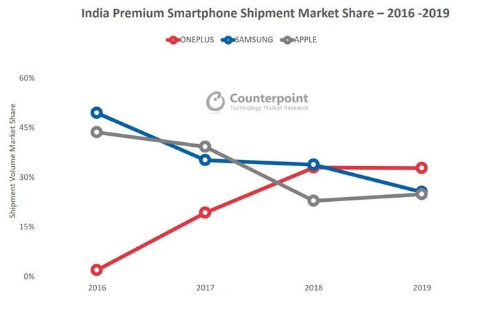 根據來自counterpoint最新數據報告,2019全年,一加手機在印度高端手機市場拿下第一。