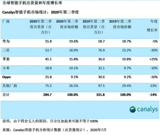 根據Canalys的另一份報告顯示,2020年第二季度,雖然華為在歐洲市場銷量有所下降,但是其全球出貨量為5580萬部,以19.6%的市場份額位居第一位居。而三星則以18.9%的市場份額位居第二。