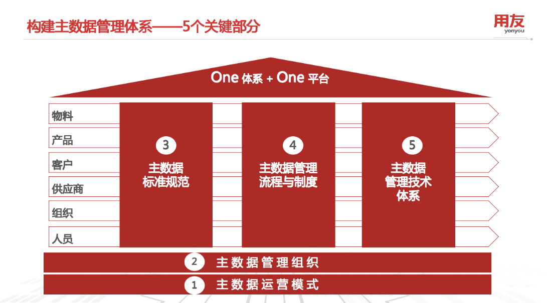 用友iuap平臺的主數據管理體系主要包括主數據運營模式、主數據管理組織、主數據標準規范、主數據管理流程與制度和主數據管理技術體系五大關鍵部分。通過主數據管理,可以實現優化系統應用架構,統一用主數據系統管理主數據,避免原有各業務系統間點對點對接,管理更統一、更標準;降低業務運營成本和執行風險,提高業務執行效率;提升企業數據質量,通過對主數據規范化、標準化的管理,為企業經營決策提供更準確、全面的數據支撐。