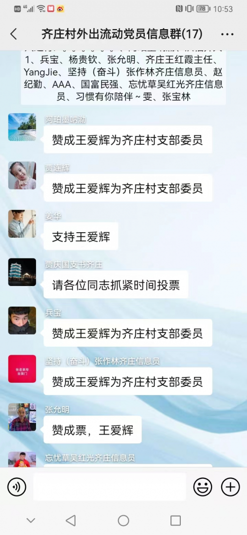 “綜合齊國禎、王愛輝兩位黨員的基本情況,我投王愛輝同志一票。她做為南昌理工學院的大學生,在外工作幾年后現在愿意留村發展,值得肯定和支持。同時也感謝駐村第一書記劉濤同志為我村推薦的人才及組織對我們在外黨員的信任。”“大學生村官,我投票支持王愛輝、我投票支持王愛輝”