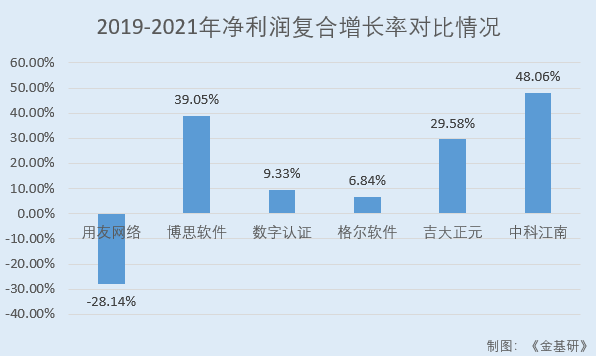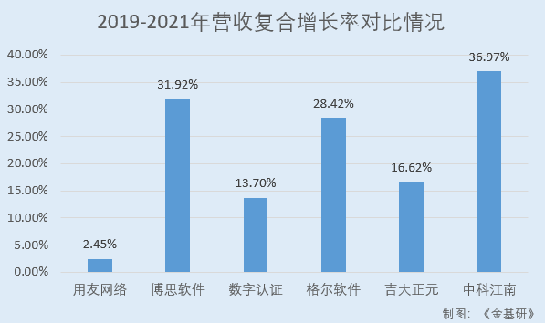 據東方財富Choice數據,2019-2021年,中科江南同行業可比公司用友網絡科技股份有限公司(以下簡稱“用友網絡”)的營收復合增長率為2.45%;福建博思軟件股份有限公司(以下簡稱“博思軟件”)的營收復合增長率為31.92%;北京數字認證股份有限公司(以下簡稱“數字認證”)的營收復合增長率為13.7%;格爾軟件股份有限公司(以下簡稱“格爾軟件”)的營收復合增長率為28.42%、長春吉大正元信息技術股份有限公司(以下簡稱“吉大正元”)的營收復合增長率為16.62%。