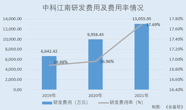 2019-2021年,中科江南研發費用分別為6,642.42萬元、9,958.45萬元和13,055.95萬元,占營業收入比重分別為16.88%、16.96%、17.69%。