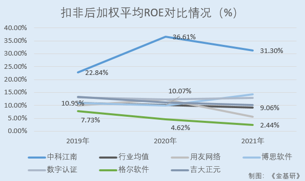 同期,中科江南同行業可比公司用友網絡的扣非后加權平均ROE分別為9.86%、12.29%、5.58%;博思軟件的扣非后加權平均ROE分別為10.85%、9.92%、14.21%;數字認證的扣非后加權平均ROE分別為13.06%、12.37%、12.87%;格爾軟件的扣非后加權平均ROE分別為7.73%、4.62%、2.44%;吉大正元的扣非后加權平均ROE分別為13.23%、11.13%、10.2%。2019-2021年,上述五家公司的扣非后加權平均ROE均值分別為10.95%、10.07%、9.06%。