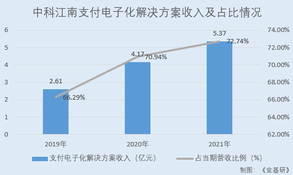 2019-2021年,中科江南的支付電子化解決方案收入分別為2.61億元、4.17億元、5.37億元,占當期營業收入的比重分別為66.29%、70.94%、72.74%。