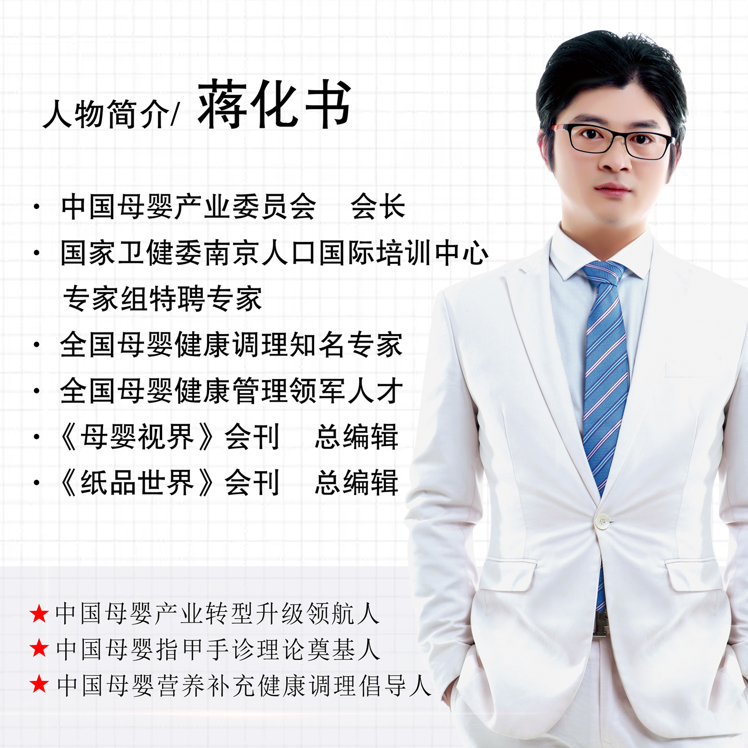 中國母嬰產業委員會會長蔣化書是國家衛健委南京人口國際培訓中心專家組特聘專家,全國母嬰健康領軍管理人才,《母嬰視界》會刊總編,全國母嬰健康調理知名專家,中國母嬰產業轉型升級領航人、中國母嬰指甲手診理論奠基人、中國母嬰營養補充健康調理倡導人。早在2018年,中國母嬰產業委員會會長蔣化書就提出,母嬰店要轉型升級為母嬰健康調理館,從單一售賣母嬰產品,轉型升級到母嬰健康調理上來。