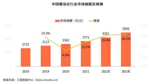 根據艾媒咨詢數據,近幾年,中國健身行業的市場規模不斷增長,2021年市場規模達到3771億元,預計2023年市場規模將突破5000億元。