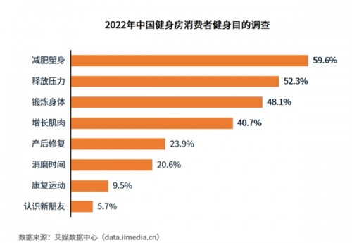 數據顯示,59.6%消費者前往健身房是為了減肥塑身,52.3%為了釋放壓力,48.1%為了鍛煉身體,40.7為了增長肌肉,其余還有產后修復、消磨時間、康復運動及認識新朋友等目的。