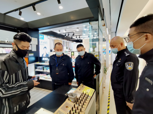 圖為:寧海縣煙草專賣局工作人員聯合縣市場監督管理局工作人員對電子煙零售店開展專項檢查。(王偉杰 攝)