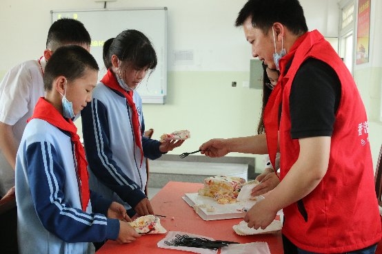 (圖為志愿者與孩子們分享節日蛋糕李夢怡攝)