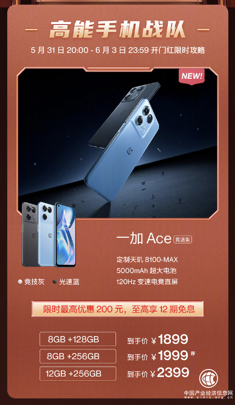 5月31日晚8點,一加Ace競速版高能開售,到手價1899元起。除Ace競速版外,618活動期間購買一加產品可享受限時福利價,一加 Ace低至2499元起,一加 10 Pro低至4199元起,一加 9RT低至2449元起,IoT產品全線直降低至169元起。購買還可享受免息分期、至6月30日的超長周期價保等福利。同時,用戶還可參與一加“百場5折福利“、直播抽百臺手機大獎”、“一加錦鯉全家桶”等驚喜活動。