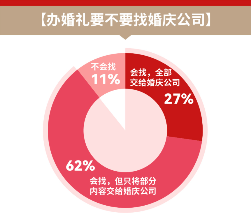 如今,新人們要舉辦婚禮就避免不了考慮要不要找婚慶公司,因為婚禮涉及到風格選擇、流程籌備、攝影預約、搭建風格、婚紗攝影等事項,而大多數新人們沒有足夠的經驗應對籌備婚禮中出現的問題,所以婚慶公司應運而生,尤其是專業化的婚慶公司愈發受到適婚人群的青睞。調查顯示,近九成適婚人群表示如果籌辦婚禮會選擇婚慶公司,所以大部分婚禮現場都能看到婚慶公司工作人員的身影。婚禮堂,作為近年來開始流行起來的一站式婚禮服務模式,其省時省心省力、價格友好的特點也逐步成為適婚人群的一個不錯的選擇,是當今性價比較高的婚禮服務模式,受到半數左右知曉一站式婚禮服務模式的男女青睞。