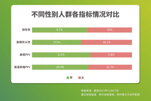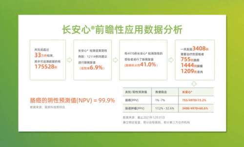 截至2021年12月,作為持續披露真實世界應用數據的腸癌糞便基因檢測產品,長安心?共完成33萬例前瞻性篩查,其中175528例篩查數據可追溯,12114例受檢者長安心?檢測結果陽性(陽性率6.9%),其中4970例長安心?檢測結果陽性的受檢者進行了腸鏡復查(腸鏡依從性41.0%),一共發現3408例需要治療的受檢者,其中755例腸癌,1444例腺瘤,1209例息肉。長安心?對腸道腫瘤的陽性預測值(PPV)為68.6%(其中腸癌的陽性預測值為15.2%),來自國家科技部項目的數據顯示,長安心?的陰性預測值更是高達99.9%。