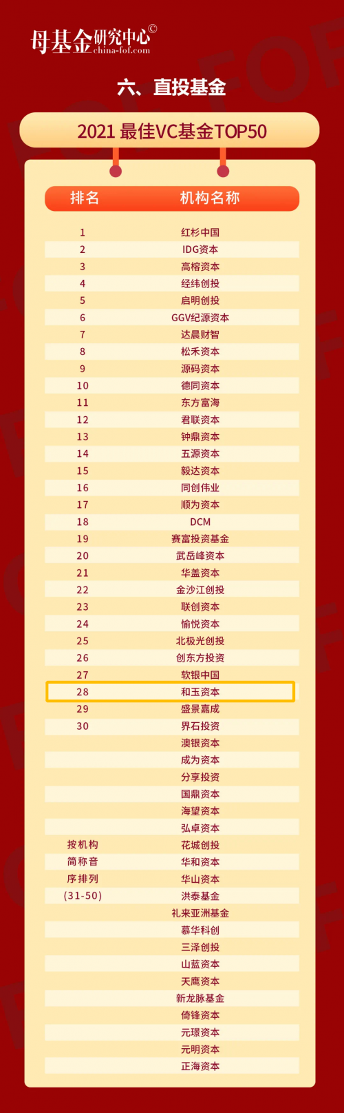 近期,母基金研究中心發布2021年度榜單,和玉資本(MSA Capital)榮獲「2021最佳VC基金TOP30」,和玉資本創始人、管理合伙人曾玉女士榮獲「2021最受母基金歡迎的VC基金創始合伙人TOP30」。