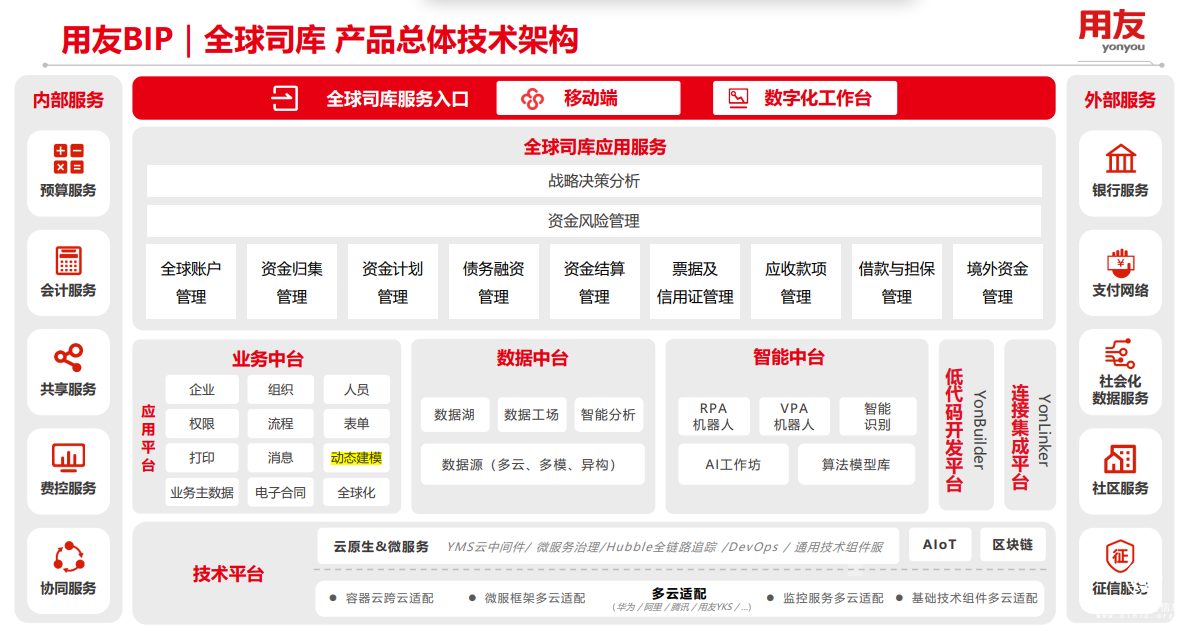 用友BIP全球司庫(圖2)基于“流程驅動+數據驅動”的全新設計理念,在技術平臺和業務中臺、數據中臺、智能中臺能力基礎之上,構建起全方位的數字化司庫場景應用,支撐企業轉向金融資源運作的價值創造過程。