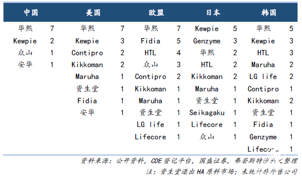 從不同級別透明質酸原料來看,醫藥級原料對生產技術、質量控制的要求更高,各國對于醫藥級原料的市場準入均具有嚴格的標準,準入資質取得流程通常在2年以上,下游產品生產廠家的同一規格產品如更換新供應商需要再次審評,因此市場先進入優勢較大,質量穩定、國際資質齊備的原料供應商容易建立長期龍頭優勢。