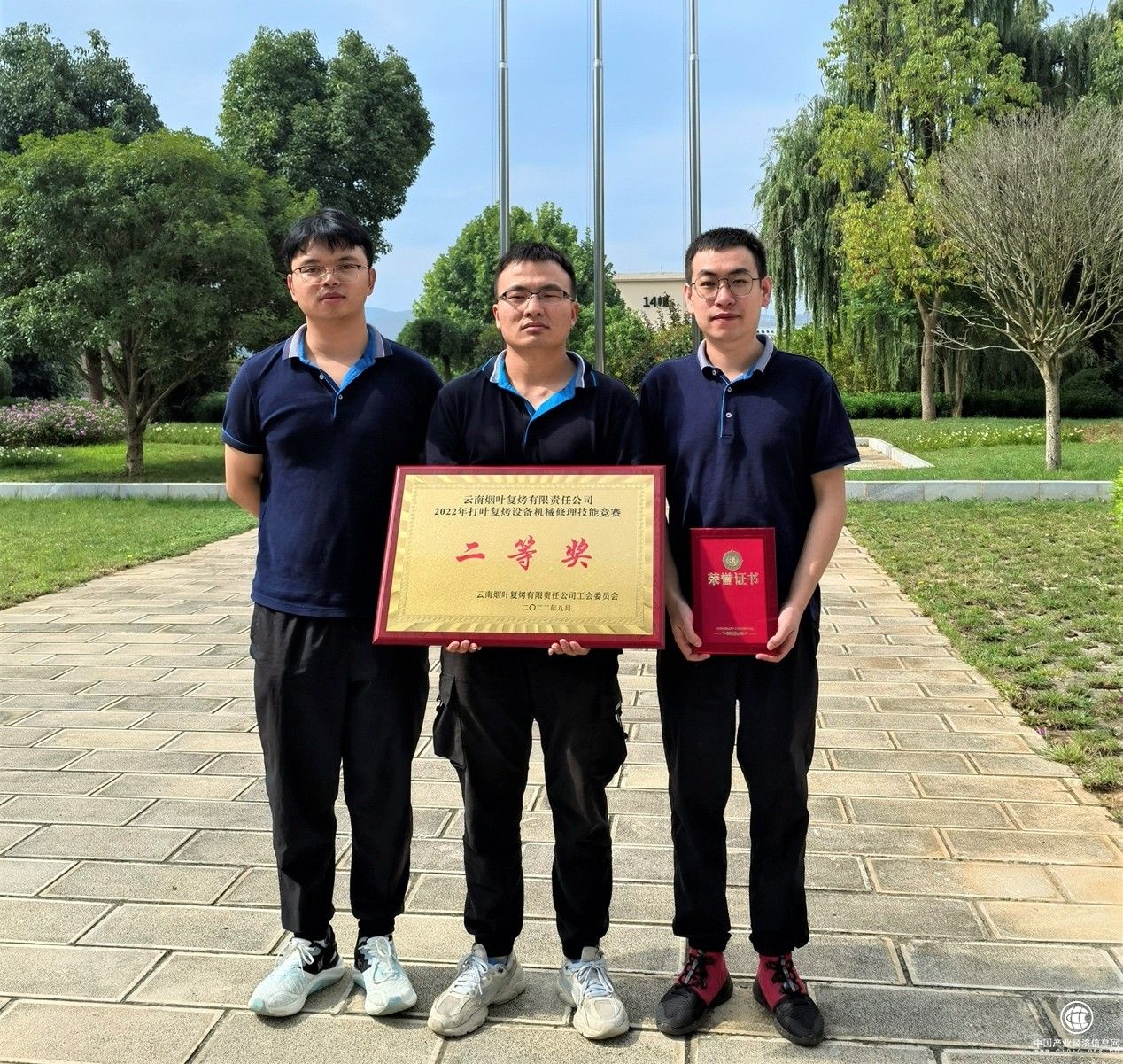 在云南煙葉復烤公司2022年打葉復烤設備機械修理技能競賽中,張愷(左)所在的宣威復烤廠代表隊獲得團體二等獎。(夏自麟 供圖)
