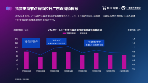 據有米有數數據顯示,2022年1-8月,廣東省的抖音直播電商銷售數據在1月、3月、6月等時間點出現峰值,可見抖音電商舉辦的大促活動對廣東省商家的直播表現有明顯拉升作用。