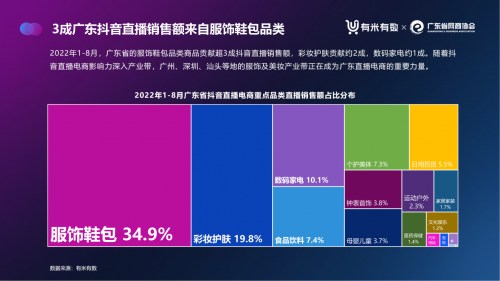 從品類分布來看,在廣東商家創造的銷售額里面,服飾鞋包品類占了3成,依次是彩妝護膚,貢獻約2成,數碼家電約1成。