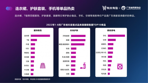 從細分單品來看,廣東商家賣得較好的是連衣裙、T恤等百搭服飾,護膚套裝、面膜等日常護膚必備品以及手機、空調等高客單價商品。