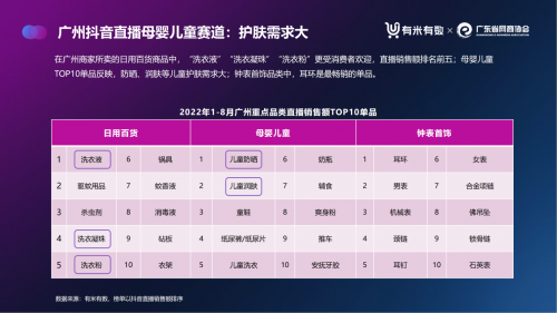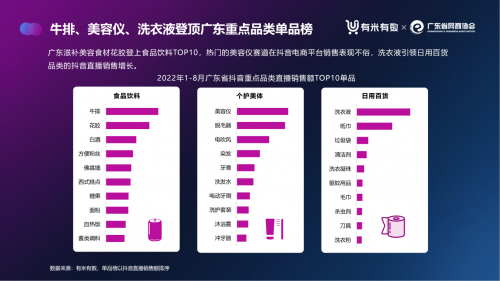 廣東滋補美容食材花膠也登上食品飲料TOP10,洗衣液引領日用百貨品類的抖音直播銷售增長,熱門的美容儀賽道在抖音電商平臺銷售表現不俗。