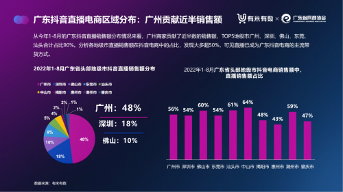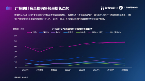 8月和1月相比抖音直播銷售額增長18.42%, 深圳、佛山、東莞和汕頭的抖音直播銷售額則穩中有增。