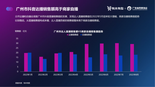 分開達播和自播去觀察廣州市抖音直播銷售額的發展,發現達人直播銷售額在2022年5月迎來較大增幅,商家自播銷售額趨勢比較穩定。