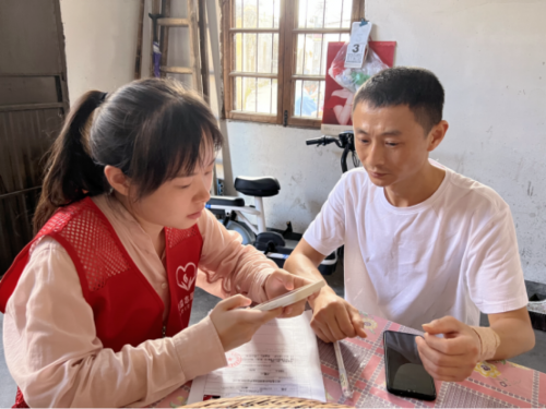 圖為“香溢”志愿者劉美燕向學生家長了解助學對象家庭情況。(葉蘇蘇 攝)