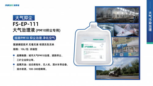 在PM10治理方面,福賽福PM10抑塵專用產品通過氫鍵捕捉技術,實現去除PM10、抑塵、凈化空氣的作用,對于城市大氣PM10治理、道路抑塵、工礦企業抑塵有明顯的效果。