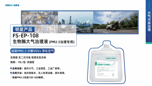 在PM2.5治理方面,生物酶大氣治理液(PM2.5治理專用)可以實現高效便捷的應急治理,產品中的活性高分子成分帶有正電荷,具有強力的吸附凝聚功效,使空氣中的固體小顆粒團聚與產品中的液體凝聚成小液滴降落,從而凈化空氣,適用于城市大氣環境、工業園區及周邊開放環境、工業廠房車間內部的PM2.5污染治理。