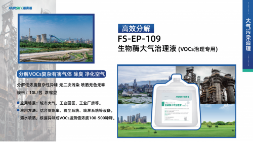在VOCs治理方面,生物酶大氣治理液(VOCs治理專用)對于低濃度復雜成分的VOCs氣體有顯著的催化分解效果,通過霧化技術處理噴灑,酶分子可以有效吸附和捕捉環境和空氣中的有害分子,直接改變有害氣體分子結構, 將污染物有機物徹底分解成為二氧化碳和水,達到凈化作用,適用于城市大氣、工業園區、工業廠房等場景的VOCs超標治理,實現大氣污染的長效治理。