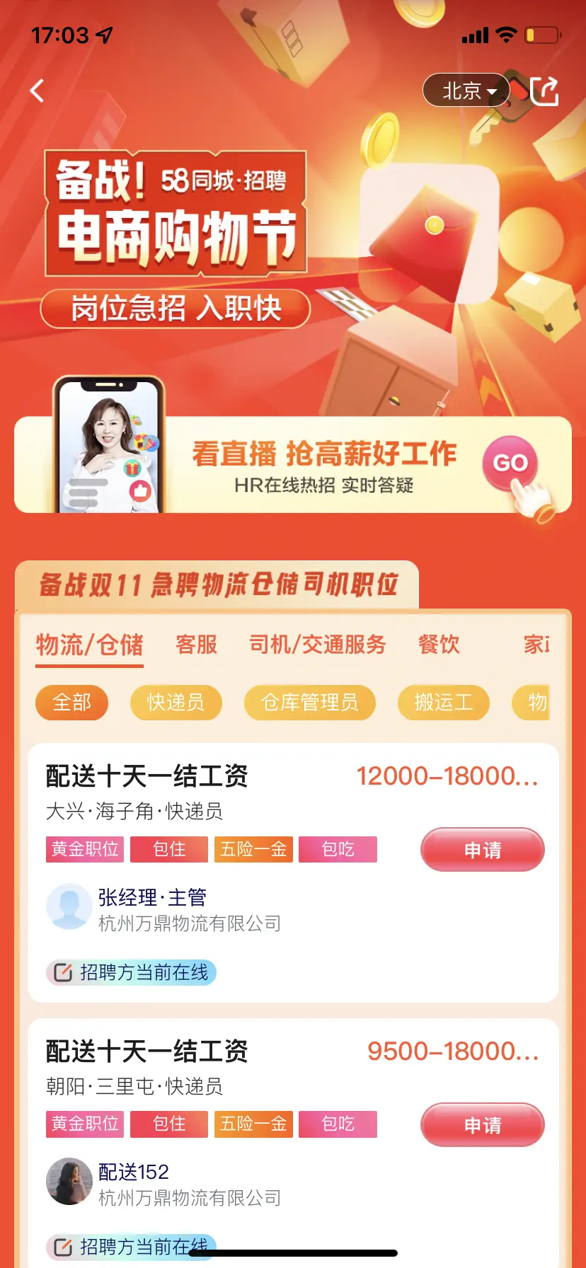 物流行業是典型的體能型、勞動密集型行業,由于工作環境艱苦、勞動強度大、招聘求職雙方信息不對稱等原因,對年輕人缺乏吸引力,加上當前行業競爭激烈,“招工難”成了困擾許多物流企業經營的痛點。為增強企業與求職者之間的互動,58同城在本次“備戰電商購物節”招聘專場開設直播招聘板塊,專業主播和企業HR將圍繞企業及職位進行實時答疑,助力招聘企業實現聲量和效果轉化雙豐收。