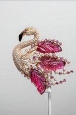 粉色火烈鳥是卡地亞動物主題作品中常見的鳥類形象。這款作品在傳統自然主義風格中結合部分抽象手法,火烈鳥頭部雕刻逼真,玫瑰金與縞瑪瑙的組合突出鳥喙形象。三顆雕刻紅碧璽躍然而出,羽毛以雕刻寶石與抽象線條交錯顯現,意趣十足。