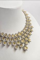 卡地亞選用獨特八面體造型黃鉆重構龍這種奇幻生物的鱗甲。這種八邊形的幾何形狀極少用于珠寶創作中,彰顯卡地亞對別具個性的寶石的鐘愛之情。79顆黃鉆鑲嵌于鋪鉆六邊形幾何結構中央,構成盤錯的幾何網格。每個幾何結構僅以下半部固定黃鉆,結構間彼此相連,以精準的設計和工藝構筑新穎佳作。