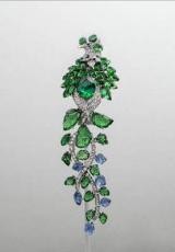 卡地亞動物王國迎來全新形象——來自南美洲的獨特鳥類,鳳尾綠咬鵑。這款胸針以非寫實手法演繹:一顆帕拉伊巴碧璽構成鳳尾綠咬鵑的身體,鳥羽完全以綠色沙弗萊石和藍寶石組成,營造卡地亞經典藍綠對比色的“孔雀圖案”。