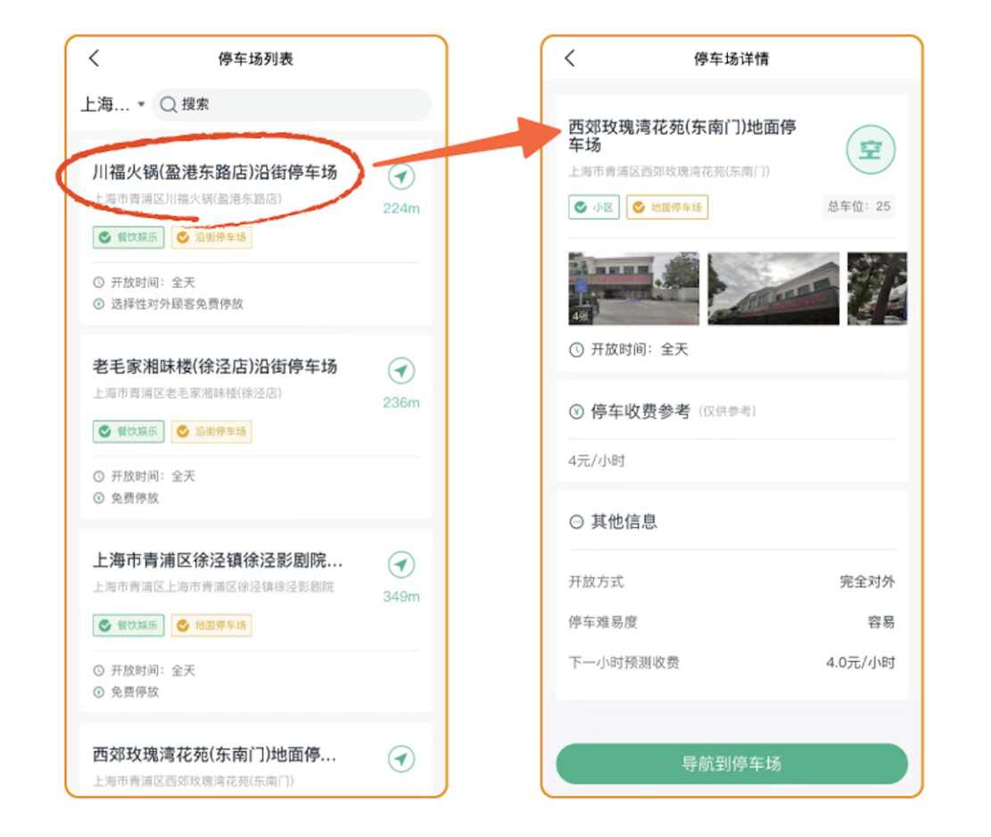 Step2:點擊任一停車場,可查看該停車場詳情;詳情可查看開放時間段、收費參考、車位空閑情況等信息;