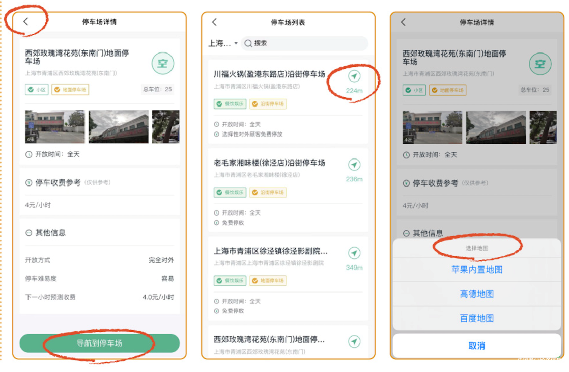 Step3:確定選擇的停車場后可在“停車場詳情”頁點擊下方“導航到停車場”/點擊按鈕“<”返回停車場列表頁,點擊導航符號,選擇地圖后直接開啟導航,開往停車場;