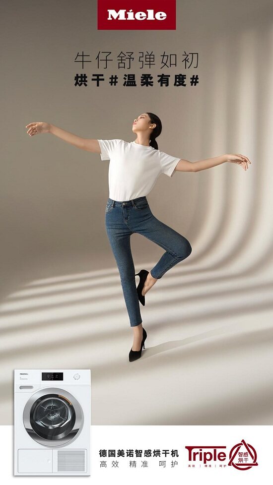 日常穿搭,牛仔褲洗曬后緊繃干硬?美諾Miele智感烘干機精準烘干,均勻烘干面料纖維,遵循織物的分子運動,讓牛仔褲舒彈如初,保護面料的同時固色護色,呵護衣物鮮色盎然,盡情展現瀟灑姿態。