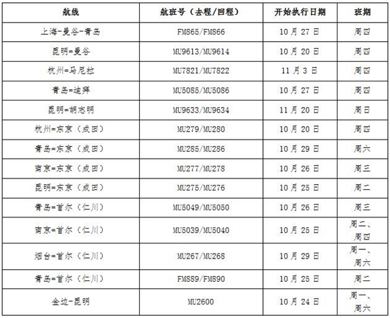 此次新增的國際航線將于10月20日起逐步開始執行,其中昆明—曼谷、杭州—東京成田航線20日起恢復,每周1班;金邊—昆明航線24日起增至每周2班,昆明—東京成田、南京—首爾仁川、青島—首爾仁川航線25日起恢復;南京—東京成田、青島—首爾仁川航線26日增至每周1班;上海—曼谷—青島、青島—迪拜航線27日增至每周1班;青島—東京成田、煙臺—首爾仁川航線29日起執行。進入11月,東航還將陸續恢復和加密杭州—馬尼拉、昆明—胡志明等國際航線。具體航班計劃以東航官網實際查詢為準。