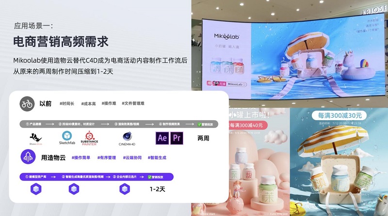 此次會上,造物云還將開放企業級產品的內測申請。相關負責人介紹,造物云的3D可視化技術可以對食品快消、美妝個護、家居日用、母嬰兒童、3C數碼這些產品長尾、高頻營銷、情感溢價等屬性的行業,帶來顯著的營銷降本增效的效果,節省高達90%的視覺制作預算。造物云的企業版更加關注于企業內部3D資產管理、內容創作與協作、內容分發管理的能力。