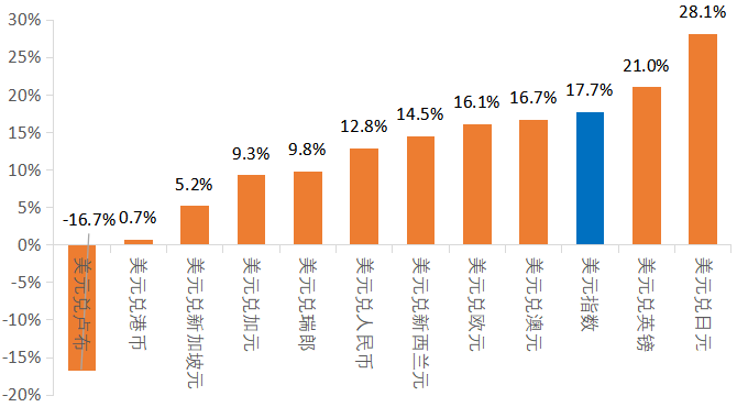 圖3 2022年年初至10月14日美元兌全球主要貨幣匯率變化