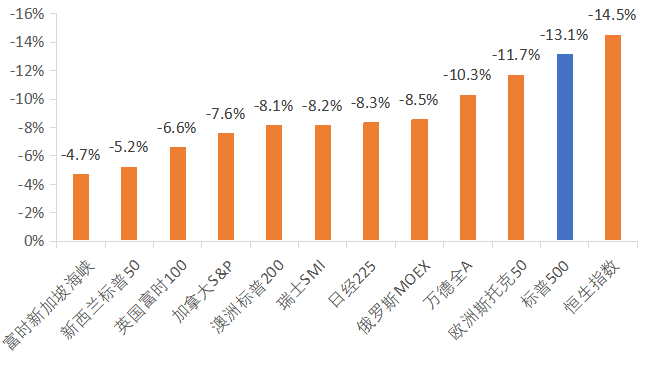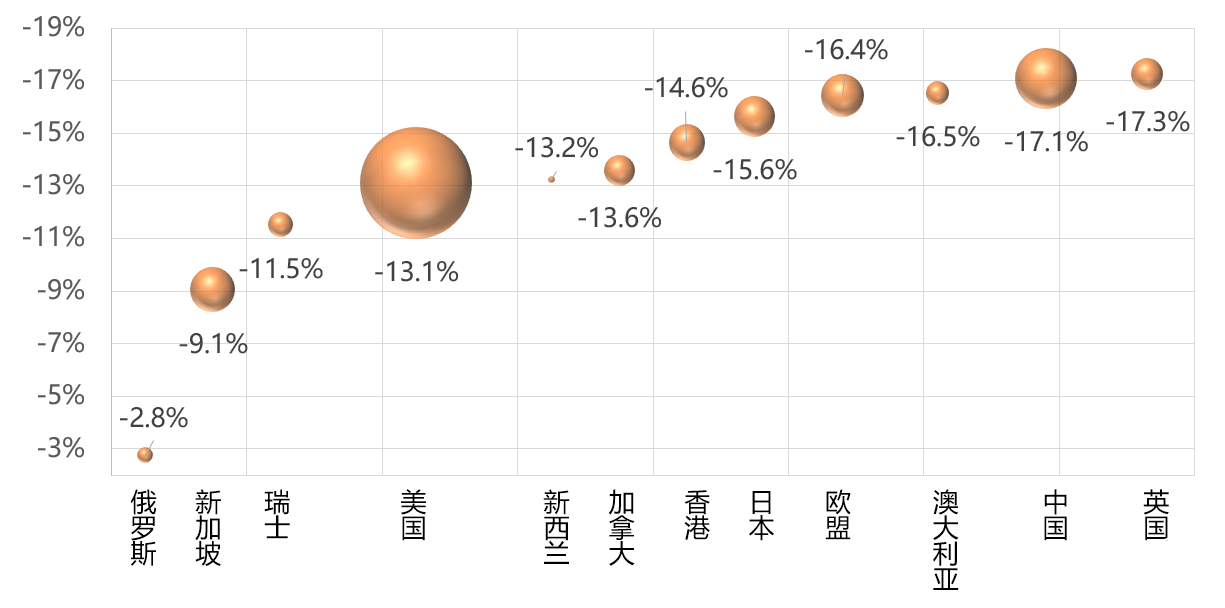 注:圖中球的面積代表各個權益市場的規模,美元化權益資產收益率 = (1+美元匯兌收益率)*(1+本幣權益收益率)-1,各個國家和地區選擇代表性股指分別為:俄羅斯MOEX、富時新加坡海峽指數、瑞士SMI、標普500指數、新西蘭標普50、加拿大S&P、恒生指數、日經225、歐洲斯托克50指數、澳洲標普200、萬德全A、英國富時100。