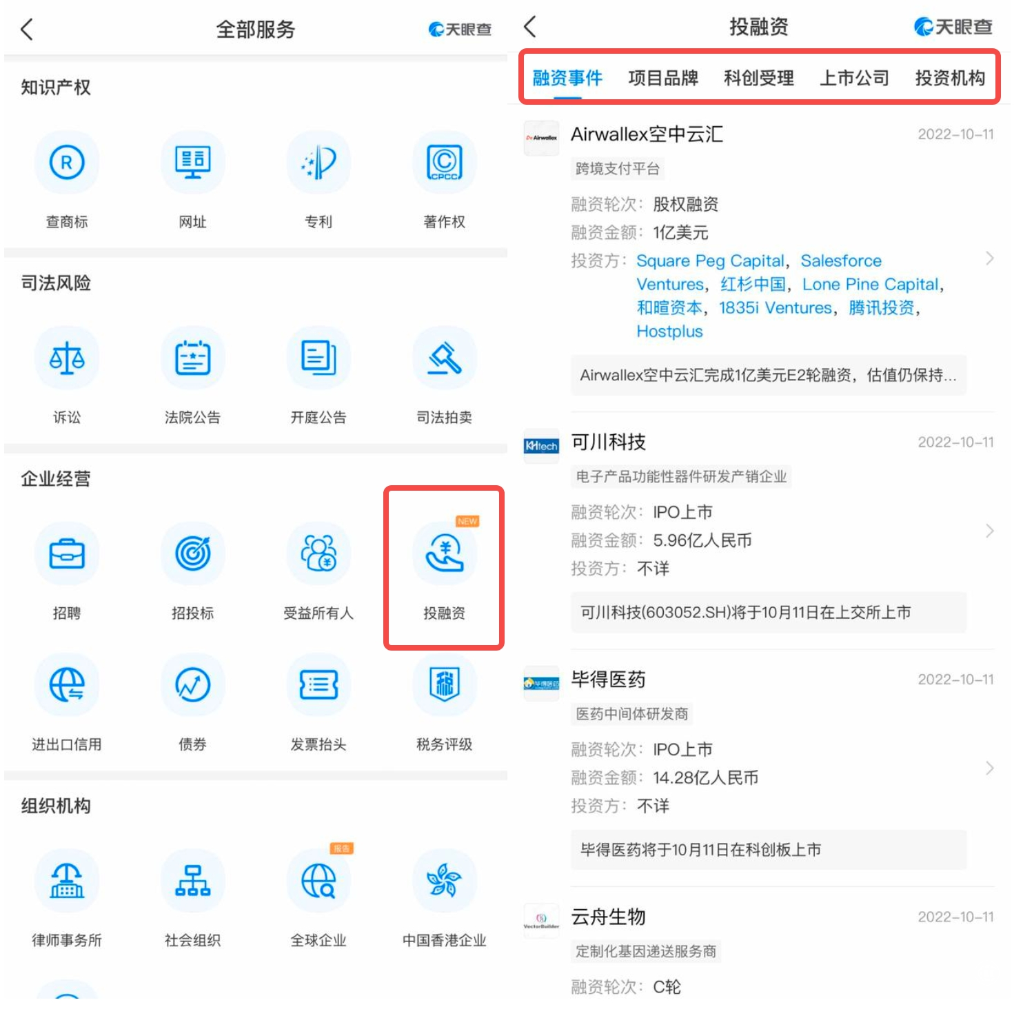 胡總監提醒,對于TOB銷售而言,以較低的成本,找到有良好現金流、有買單能力的客戶,比如說剛剛獲得融資的客戶,是形成訂單的“訣竅”所在,這樣會節省大量時間成本。天眼查的“投融資”功能,整合了融資事件、項目品牌、投資機構等信息披露功能,便于用戶及時掌握近期最大規模投融資事件、各省市地區項目品牌融資情況、熱門投融資行業分布、不同投資機構青睞賽道等信息,充分滿足了銷售前期盡調的需要。打開天眼查APP,經由首頁進入全部服務即可使用。
