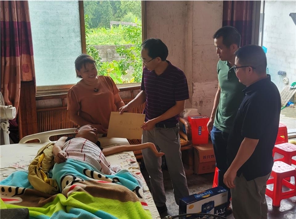 圖為:環江煙草領導班子為羅覃寶送上中秋節慰問禮品(唐春 攝)