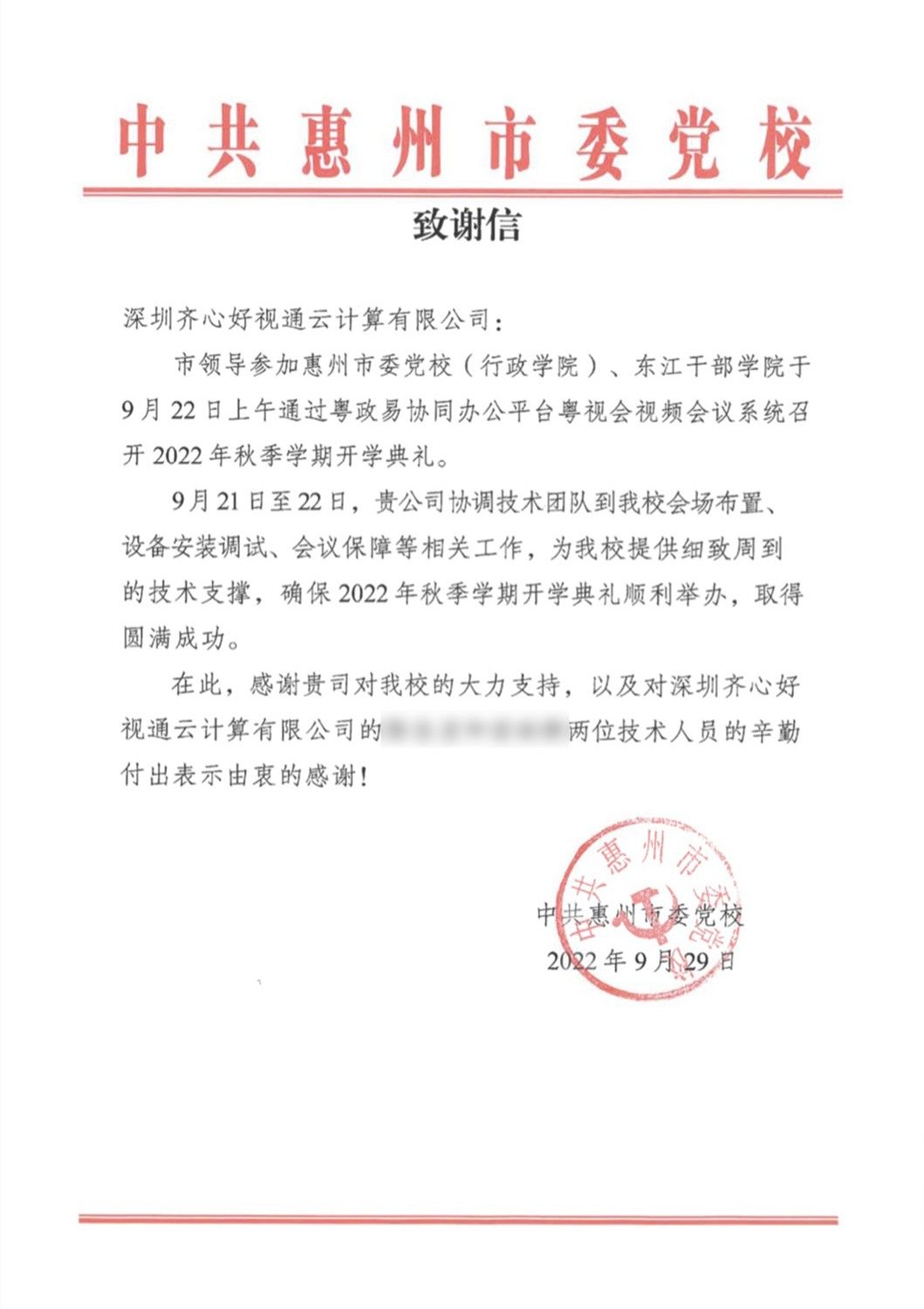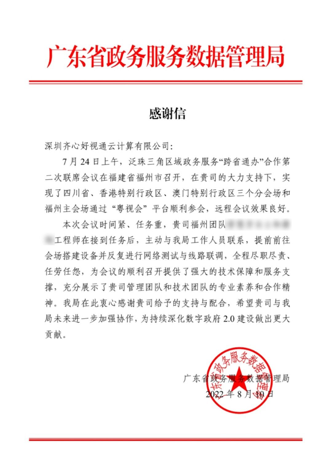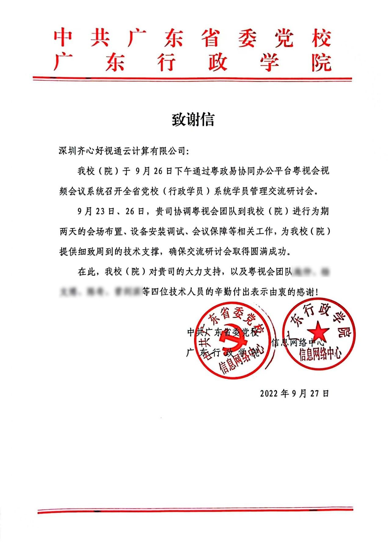 感謝信分別來自中共廣東省委黨校(廣東行政學院)、中共惠州市委黨校、廣東省政務服務數據管理局及江門市政務服務數據管理局,信中對好視通專業細致的支持保障、高清流暢的云視頻會議體驗、豐富的產品應用給予了充分肯定與認可。