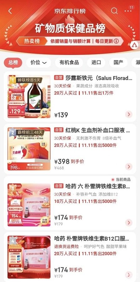 而哈藥樸雪牌鐵維生素B12口服液專為缺鐵女性打造,補鐵養血,由內而外呵護好氣色,榮登礦物質保健品榜TOP3,年度累計GMV1億+。